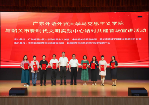 为全面贯彻落实广东省重点马克思主义学院建设任务,推进与韶关市新时代文明实践中心结对共建工作,5月9日上午,校党委副书记唐锐,校党委常委、组织部部长黄秀娟等带队赴韶关市乳源瑶族自治县出席首场基层理论宣讲活动。马克思主义学院院长毛国民、党委书记麦培年、教师代表,韶关市委宣传部常务副部长黄勤昌、乳源县委宣传部副部长胡烈文以及县各级干部和群众代表参加了活动。