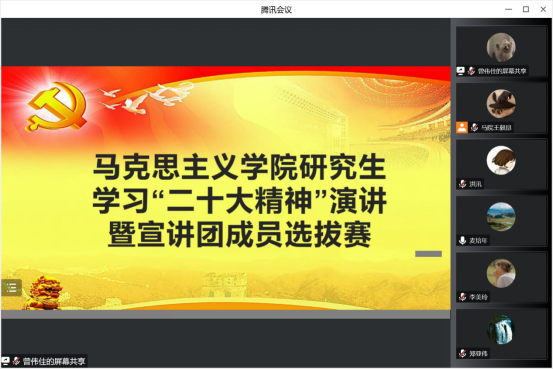 为深入学习贯彻中国共产党第二十次全国代表大会精神,11月17日晚,马克思主义学院通过腾讯会议,以线上形式举办研究生学习“二十大精神”演讲暨宣讲团成员选拔赛。此次活动由马克思主义学院曾伟佳老师主持,2021级、2022级共12位研究生参赛,学院党委书记麦培年、正处级组织员林绍雄出席活动,副院长郑亚伟、基础教学部主任雷艳芝、概论教学部教师洪汛担任活动评委。
