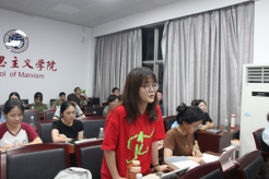郭家玮同学分享《共产党宣言》及其当代价值,她分享的主要内容是资产者和无产者、无产者和共产党人、社会主义和共产主义的文献、共产党人对各种反对党派的态度这四个方面,最后以“全世界无产者,联合起来”的伟大号召作为结束语,并表示学习《宣言》要不忘初心、坚定理想信念,要坚持中国特色社会主义的正确道路以及坚定不移地坚持以科学社会主义理论指导。