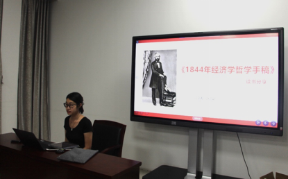 赵嘉颖同学分享是《1844年经济学哲学手稿》。她从“工资”“资本的利润”“地租”这几个关键词引出政治经济关系下的阶级矛盾产实质,以及马克思对政治经济学的批判与劳动异化概念,科学地论证了共产主义的重要作用,并在最后总结道这篇著作是马克思思想史上的一个由青年黑格尔派向唯物史观的创立的重要转折点。