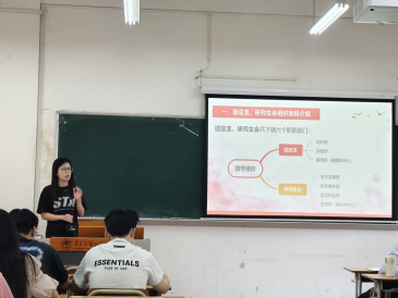 紧接着,谢佩璇、韦思诗对团总支、研究生会的学生干部进行了工作培训。谢佩璇介绍了组织架构下设的组织部、宣传部、实践部、学术发展部、综合事务部、生活权益部的职能及工作任务。韦思诗对各部门职能划分和工作衔接方面强调了以下几点:一是有效对接工作,保障团学组织整体运转顺畅与高效,要明确职责分工,建立高效沟通机制。二是明确自己的职责范围,减少工作过程中的摩擦。三是建立高效的沟通机制,如定期会议,通过沟通工具(微信群组,腾讯会议)或书面沟通的方式,每次会议要形成会议记录。三是设置明确工作流程。四是建立标准化的跨部门工作流程,可以有效提升工作对接的效率。