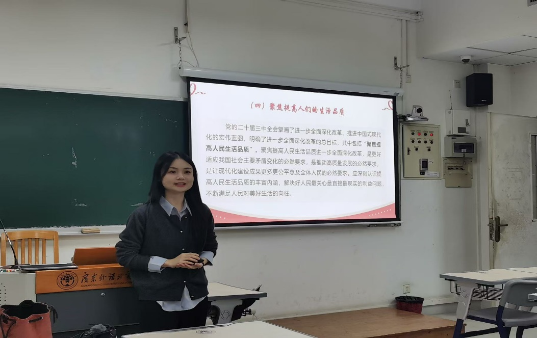 2024年12月12日晚,广东外语外贸大学马克思主义学院“云山小马”宣讲团在大学城校区G310教室开展了一场以“牢牢把握七个聚焦,继续把改革开放推向前进”为主题的宣讲活动。本次活动旨在深入学习贯彻党的二十届三中全会精神,特别是关于全面深化改革和推进中国式现代化的重要论述。