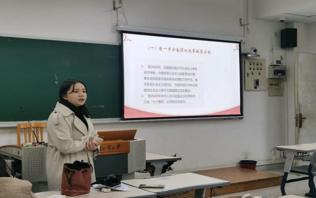成员们对“七个聚焦”进行了全面而细致的解读。聚焦构建高水平社会主义市场经济体制方面,以浙江义乌为例,讲述了其如何通过政府与市场的有效结合,激发经济主体活力,为同学们呈现了社会主义市场经济体制优势在实践中的具体体现。