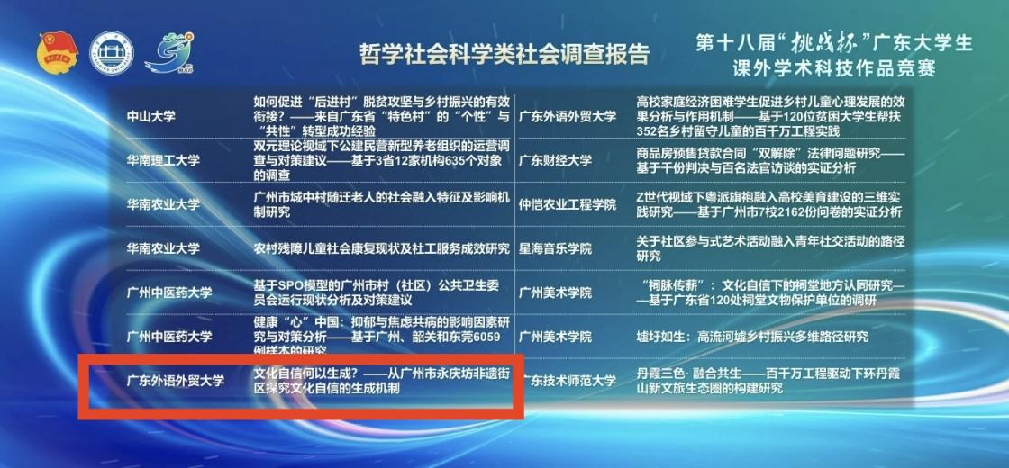 近日,我院研究生团队一个项目《文化自信何以生成?——以广州市永庆坊探究文化自信的生成机制》在肇庆学院举行的第十八届“挑战杯”广东大学生课外学术科技作品竞赛终审决赛荣获广东省二等奖。这是我院研究生在“挑战杯”广东大学生课外学术科技作品竞赛首次获奖和突破。项目由刘海春、郭嫄任指导老师,由余艺帆、刘倩茹、卢晨颖、彭嘉欣、刘雅丹、张婉婷、周原源、李思达等8名同学组成。该项目凭借对文化自信生成机制的深入分析、详实的调研数据以及新颖的研究视角,在众多参赛项目中表现突出,入围终审决赛,最终荣获广东省二等奖。这一成绩体现了该项目在学术层面的价值,也反映出我院在人才培养和科研创新方面取得的成效。