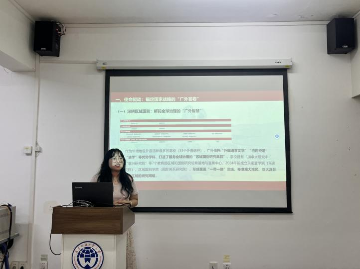 主讲人汤瑞莹聚焦时代担当与展望,介绍学校以 33 个语种构建区域国别研究集群、推动国际传播的成果,以及青年学子在广交会服务、创新创业中的表现,呼吁师生传承 “明德尚行”精神,助力学校“双一流”建设与国家战略。