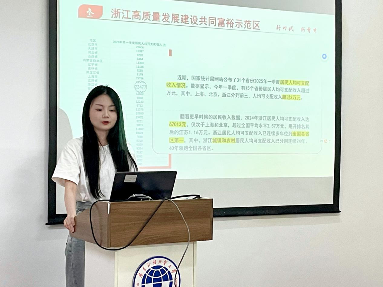 宣讲中,通过浙江“共同富裕示范区”建设、“百千万工程”等典型案例,展示了我国在收入分配制度改革和实践探索中的“中国方案”。此外,主讲人还从数字化治理、三次分配创新、人力资本激励等四个维度,展望了未来制度优化的发展路径,引发现场同学们的热烈共鸣。