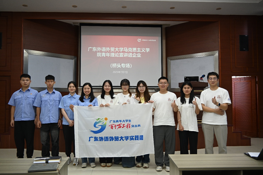 为深入学习贯彻习近平新时代中国特色社会主义思想,全面落实省委关于“百县千镇万村高质量发展工程”的部署要求,广东外语外贸大学马克思主义学院 “百千万工程” 突击队于2025年7月7日至11日,奔赴东莞市桥头镇开展了为期五天的青年理论宣讲暨暑期 “三下乡” 社会实践活动。此次活动联合桥头镇新时代文明实践中心和社会工作事务中心,共开展17场次理论宣讲,累计覆盖企业职工、村(社区)群众、机关青年等不同群体近300人,让党的创新理论在基层落地生根、开花结果。