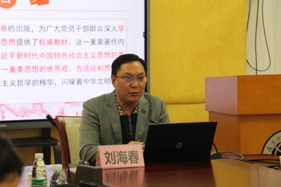 刘海春从深刻认识《习近平著作选读》的出版背景和学习《习近平著作选读》的重大意义开始阐述,具体讲述了学习的要求:四个“深刻领会、充分认识”,他从五个方面阐述了习近平新时代中国特色社会主义思想实现了马克思主义新的飞跃。