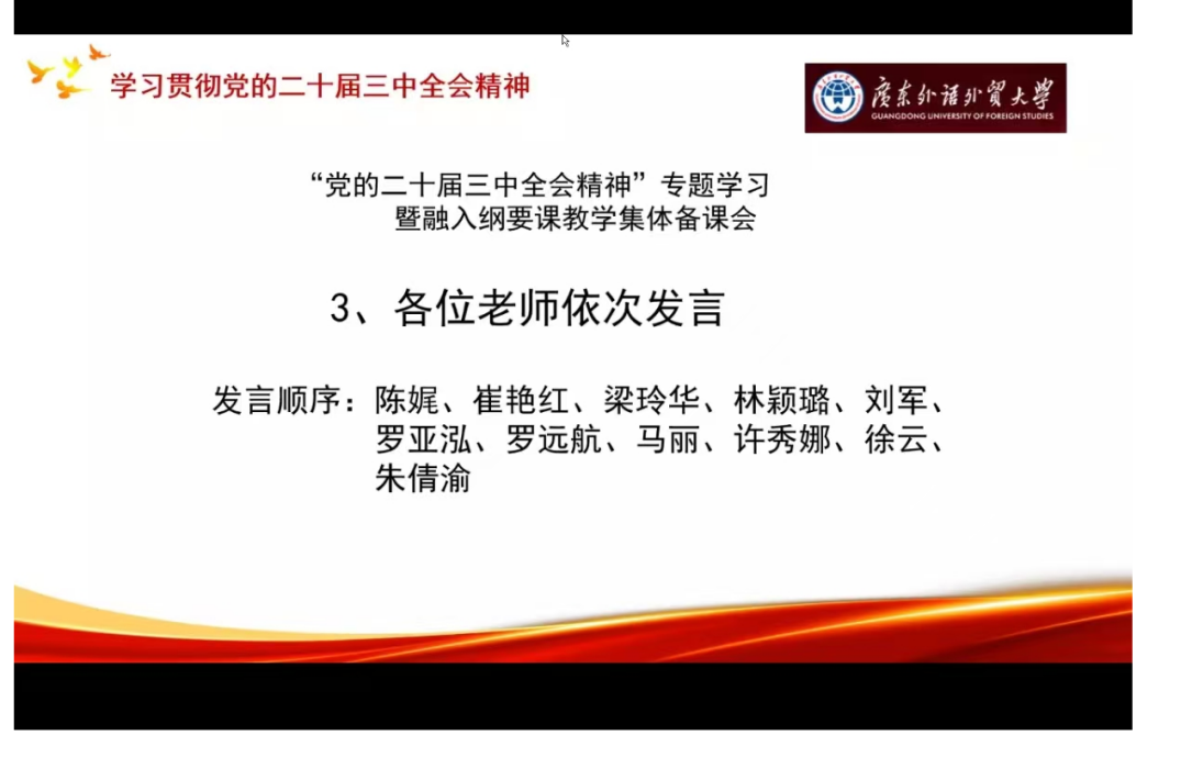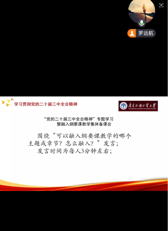 为深入学习贯彻党的二十届三中全会精神,充分发挥全国样板党支部示范引领作用,推动高校“双带头人”教师党支部书记“强国行”专项行动落地,同步推进党的创新理论武装与思政课建设,持续推动党建与业务双融双促,马克思主义学院中国近现代史纲要教学部党支部于2024年9月9日举办“党的二十届三中全会精神”专题学习暨融入纲要课教学集体备课会,活动以线上方式进行。学院党委麦培年书记、朱海龙副院长以及纲要教学部全体教师参会,教学部主任罗远航主持会议。