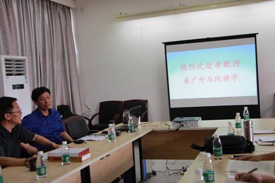 (本网讯)2016年5月29日上午,应我校人事处、教师发展中心及马克思主义学院的邀请,我校著名教授讲坛第303讲邀请了湘潭大学李佑新教授,在广东外语外贸大学南校区教学楼A座509,以毛泽东研究中的历史虚无主义观点进行评析为主题的一次讲座。出席本次讲坛分别有来自广东外语外贸大学马克思主义学院党总支书记卢海清、广东外语外贸大学马克思主义学院院长谢迪斌、广东外语外贸大学马克思主义学院部分教师以及研究生参加了此次讲座。此次讲座由广东外语外贸大学马克思主义学院院长谢迪斌主持。