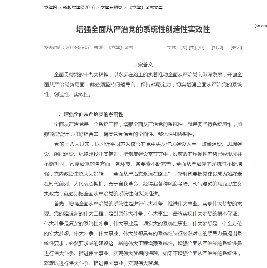 党的十八大以来,以习近平同志为核心的党中央从作风建设入手,政治建设、思想建设、组织建设、纪律建设扎实推进,把制度建设贯穿其中,反腐败的压倒性态势已经形成并不断巩固,管党治党的各方面、各环节、各要素不断完善,全面从严治党的系统性不断增强,党内政治生态大为好转。“全面从严治党永远在路上”,新时代要把党建设成为始终走在时代前列、人民衷心拥护、勇于自我革命、经得起各种风浪考验、朝气蓬勃的马克思主义执政党,就必须把全面从严治党的系统性向纵深推进。