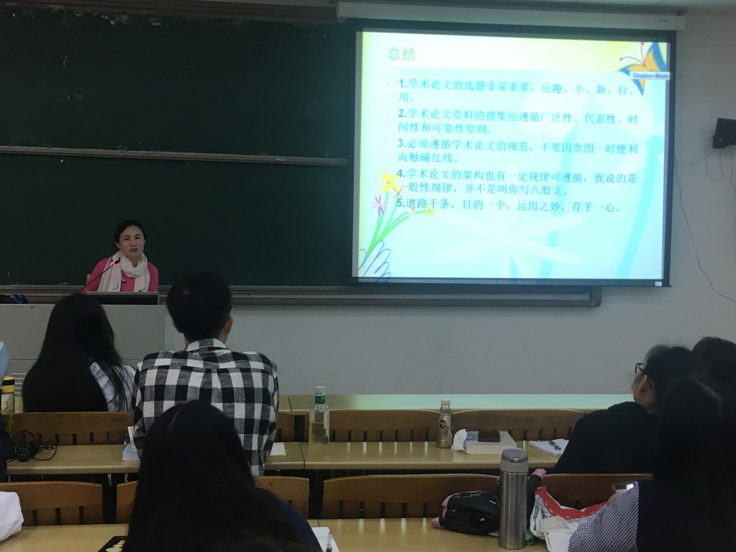 崔艳红教授以学生需求为出发点,从论文选题,资料搜集、研究综述与开题报告写作、论文基本规范、学位论文架构等方面进行了细致的讲解。崔艳红教授向学生说明遵循学术论文规范的重要性,并指出,论文选题遵循“趣”、“小”、“新”、“行”、“用”五大原则。