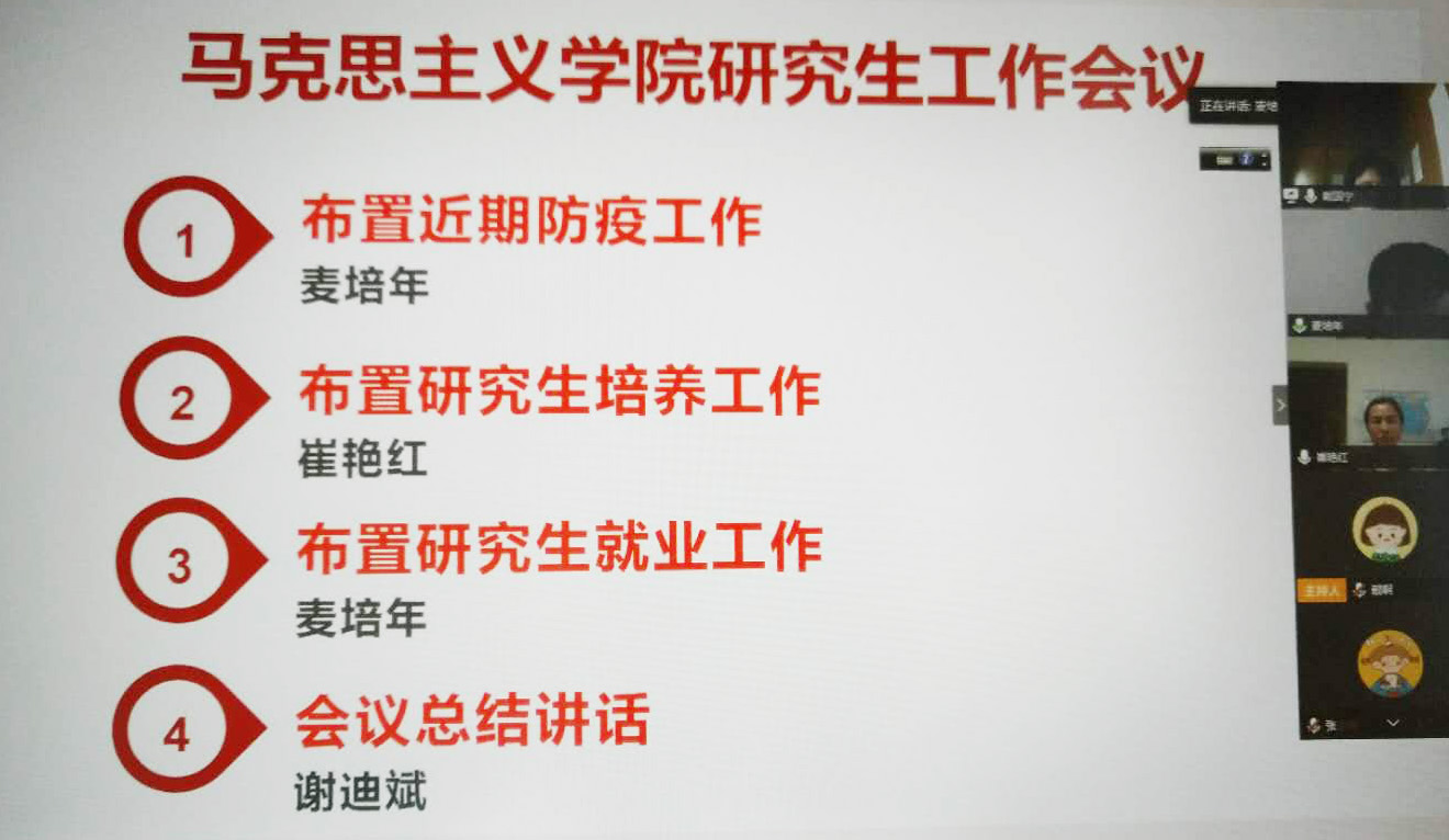 4月13日,马克思主义学院通过腾讯会议平台召开研究生工作在线会议,对疫情期间研究生工作安排进行全面部署。会议由院长谢迪斌主持,党总支书记麦培年、副院长崔艳红以及全体研究生参加会议。