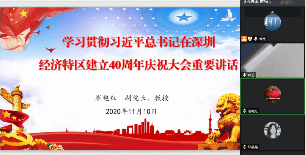 11月10日,纲要党支部全体成员开展在线集体学习活动。此次学习活动包括两项议程:一是由崔艳红副院长做关于“学习贯彻习近平总书记在深圳经济特区建立40周年庆祝大会重要讲话”的专题报告;二是集体学习《习近平谈治国理政》第三卷。此次线上活动由支部书记曾荣主持。