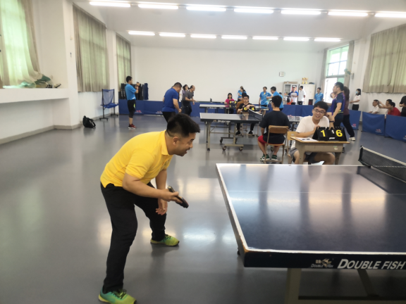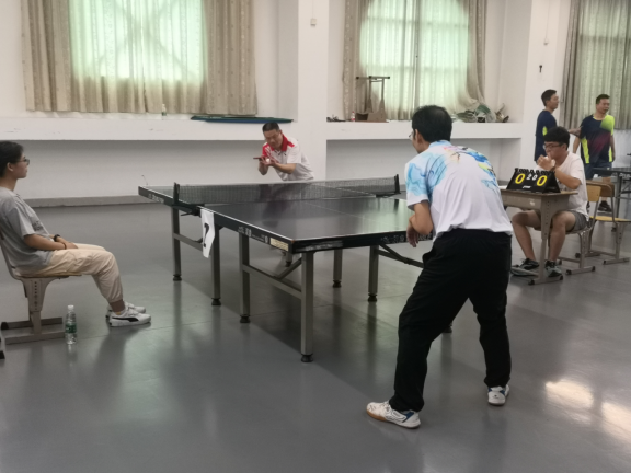 (马克思主义学院教职工乒乓球队参赛队员曾荣的比赛现场)