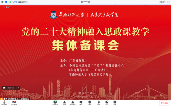 11月12日,马克思主义学院组织学院教师通过线上平台参加广东省教育厅主办,全国高校思政课“手拉手”集体备课中心承办的“党的二十大精神融入思政课教学”集体备课会,学习贯彻党的二十大精神,提升思想政治理论课教师队伍的教学水平和专业素养,推动党的理论创新最新成果进教材进课堂进头脑。