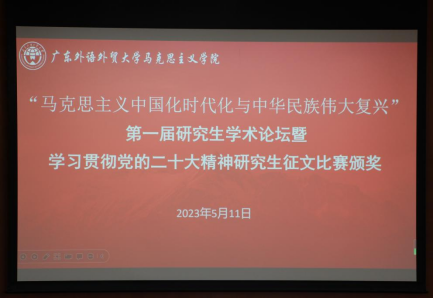 2023年5月11日,马克思主义学院在学校第六会议室举办“马克思主义中国化时代化与中华民族伟大复兴”研究生学术论坛暨学习贯彻党的二十大精神研究生征文比赛颁奖。论坛由广东外语外贸大学马克思主义学院院长助理雷艳芝主持,马克思主义学院院长毛国民、学院党委书记麦培年、研究生教学部主任洪汛、研究生辅导员龙世邦以及周彦霞、邓晶晶、练建玲三位研究生兼职班主任出席了本次论坛。