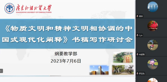 为全面深入学习贯彻党的二十大精神,推动落实有组织科研工作,按照学院科研工作部署, 2023年7月6日纲要教学部召开《物质文明和精神文明相协调的中国式现代化阐释》书稿写作线上研讨会。学院副院长曾荣教授、广东教育出版社资深编辑张韵婷老师以及纲要教学部参与书稿写作的全体教师出席,会议由纲要教学部主任罗远航主持。