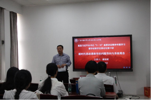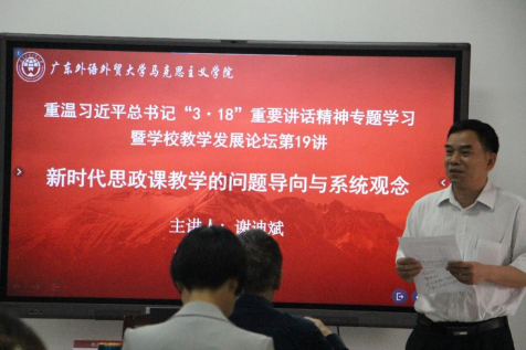2024年3月29日早上8:40,由广东外语外贸大学人力资源部(教师发展中心)主办、广东外语外贸大学马克思主义学院承办的重温习近平总书记“3·18”重要讲话精神专题学习暨学校教学发展论坛第19讲在广外大学城校区A栋教学楼509顺利举行,讲座主题为“新时代思政课教学的问题导向与系统观念”。讲座由广东外语外贸大学马克思主义学院谢迪斌教授主讲,广东外语外贸大学马克思主义学院党委书记麦培年主持。