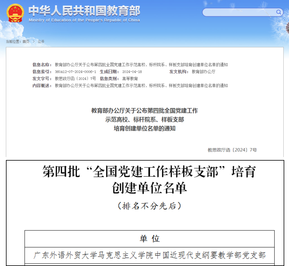 2024年4月16日,教育部、省委教育工委公布新一批全国高校党建“双创”、全省高校“双带头人”工作室培育创建单位。我院中国近现代史纲要教学部党支部入选第四批全国高校党建工作样板支部培育创建单位。