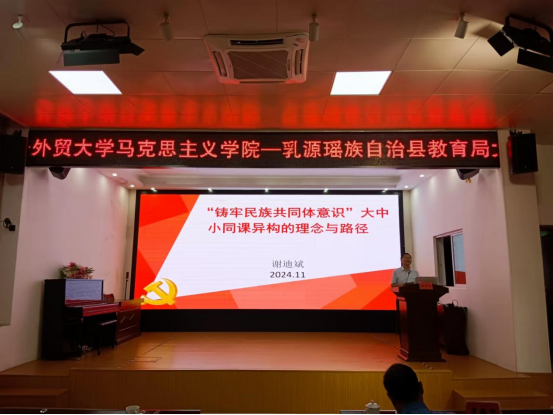 为贯彻落实广东省委、省教育工委“双百行动”工作,推动铸牢中华民族共同体意识融入大中小学思政教育一体化建设,2024年11月14日,广东外语外贸大学马克思主义学院—乳源教育局大中小学思政课一体化共同体建设工作室授牌仪式暨“铸牢中华民族共同体意识”融入大中小学思政教育一体化建设论坛在乳源瑶族自治县教育局成功举行。中央“马工程”首席专家、学院名誉院长、博士生导师谢迪斌 、学院党委书记麦培年、大学驻乳源“双百行动”服务队长、副处长毕建永以及相关广州市思政名师,乳源县教育工委书记、县教育局局长付慧燕、县教育局相关领导、县教师代表共计120多人参加本次活动,县教育局党组成员罗届中主持。