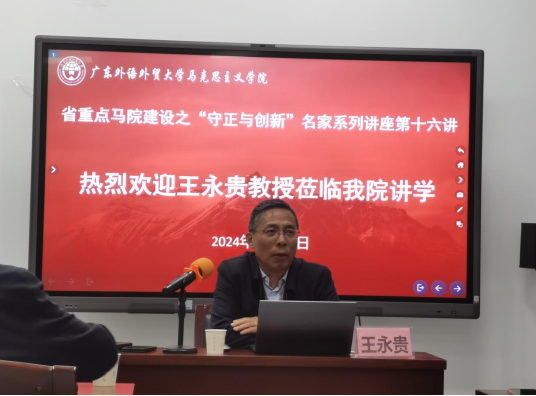 2024年11月23日下午,广东外语外贸大学马克思主义学院承办的省重点马院建设之“守正与创新”名家系列讲座第十六讲在广外大学城校区教学楼A-509顺利举行。南京师范大学马克思主义学院二级教授,教育部长江学者特聘教授王永贵以“新时代马克思主义理论学习与研究方法”为题进行讲座,马克思主义学院名誉院长、二级教授谢迪斌老师主持,学院党委书记麦培年同志及教师代表、学院研究生参加。
