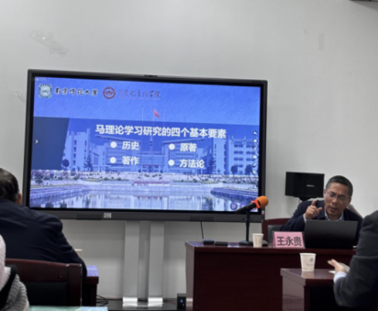 随后,为了让同学们更系统地学习马克思主义理论,王教授分享学习马理论学习研究的四个基本要素。王教授把四要素简称为“史著论法”,即历史、原著、著作和方法论。