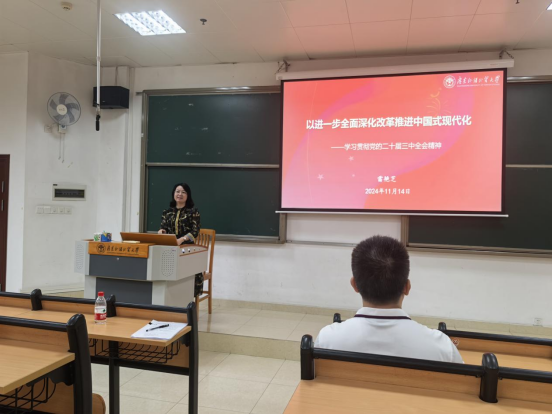 为进一步强化政治引领,以高度的历史主动和政治自觉贯彻落实党的二十届三中全会精神,根据校党委的有关安排和要求,11月14日下午,马克思主义学院在白云山校区七教213教室举办了学习贯彻党的二十届三中全会精神专题宣讲会,由学校宣讲团成员雷艳芝主讲。会议由学院院长毛国民主持。