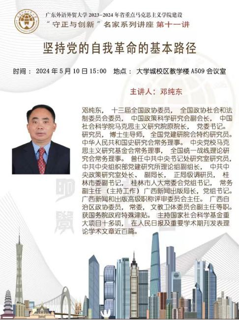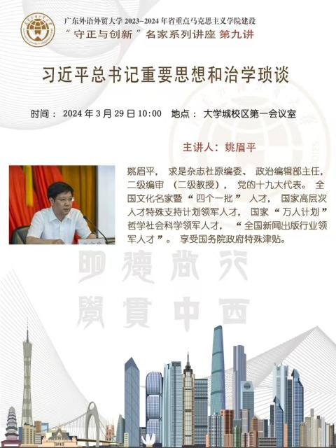 2024年,我院持续举办广东省首批重点马院建设之“守正与创新“名家系列讲座,先后邀请陈金龙、姚眉平、邓纯东、王炳林、丁匡一、田明、特雷尔·卡弗、王永贵、翟宇、薛广洲等国内外专家学者开讲,共计10余场。