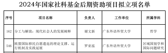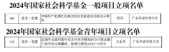 2024年,我院教师谢文新、罗亚泓、洪汛、文金贝分别获国家社会科学基金后期资助项目立项、国家社会科学基金一般项目立项、国家社会科学基金青年项目立项。