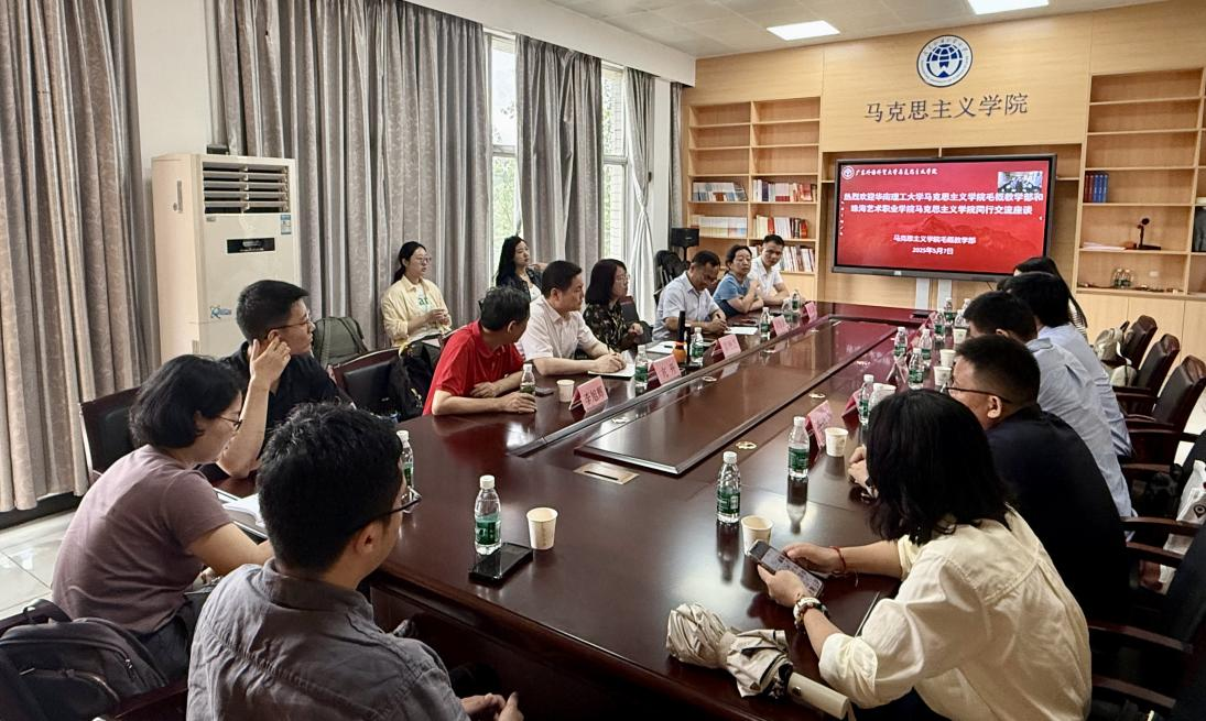 2025年5月7日上午9点,华南理工大学毛概教学部亢升主任一行5人、珠海艺术职业学院马克思主义学院黄境好院长一行7人等来我院交流,松山职业技术学院马克思主义学院全体教师在线参会,雷艳芝副院长和毛概教学部全体教师参加。 座谈会在广东外语外贸大学大学城校区马克思主义学院会议室A509举行,由毛概教学部周智武主任主持,随后于10点10分在教学楼G407教室举行教学公开课。