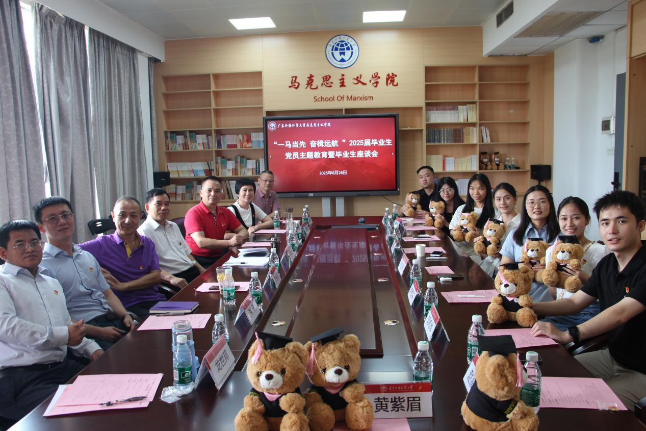 2025年6月26日上午,马克思主义学院“一马当先,奋楫远航”2025届毕业生党员主题教育暨毕业生座谈会在大学城校区教学楼A509会议室成功举办。学院党委书记麦培年,正处级组织员林绍雄,副院长朱海龙、雷艳芝,导师代表崔艳红、郑亚伟,研究生教学部主任洪汛,党政办主任兼辅导员龙世邦等教师与毕业班学生党员齐聚一堂,为2025届毕业生送上期许与祝福,共话青春新征程。麦培年书记以“一马当先,奋楫远航”为题,给毕业班党员上了离校前的“最后一课”。