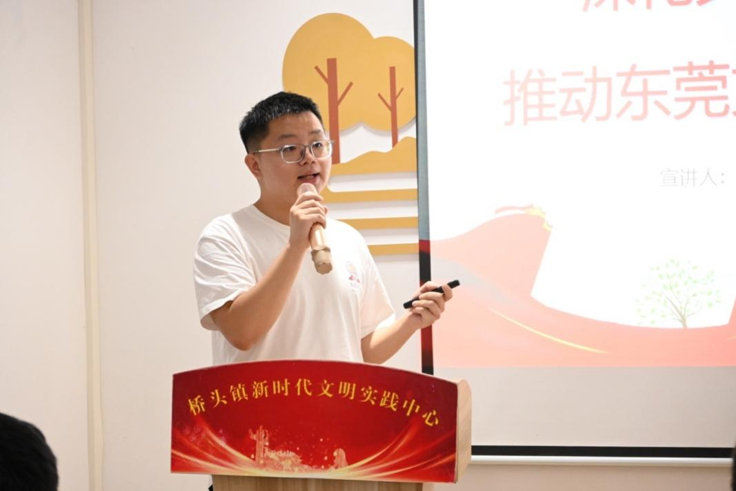 在桥头镇新时代文明实践中心,余艺帆同学带来《深化文化体制机制改革,推动东莞文艺事业高质量发展》专题报告,他系统解读了东莞在文化创新、文艺精品创作及公共文化服务等方面的改革举措与成效。现场交流环节,宣讲团成员与东莞市作家协会主席团成员刘帆对话,他表示要深耕小小说创作,让这一时代新文体成为彰显东莞文化软实力的全国性名片,为本土文艺事业高质量发展注入新动能。