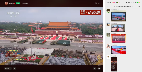 9月3日上午9时,纪念中国人民抗日战争暨世界反法西斯战争胜利80周年大会在北京天安门广场隆重举行,习近平总书记发表重要讲话并检阅部队。广东外语外贸大学马克思主义学院组织学院师生线上观看纪念大会实况直播。