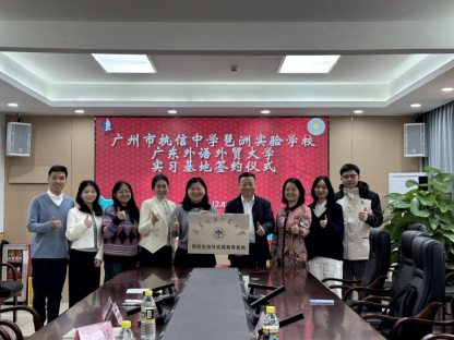 2025年12月4日上午,广东外语外贸大学马克思主义学院与广州市执信中学琶洲实验学校举行研究生校外实践教育基地签约暨授牌仪式。马克思主义学院毛国民院长、雷艳芝副院长,广州市执信中学琶洲学校张文煊校长、教研处叶昕瑶主任,以及初中各年级备课组长游艺、黄嘉铭、纪宇萍等教师代表出席本次活动。