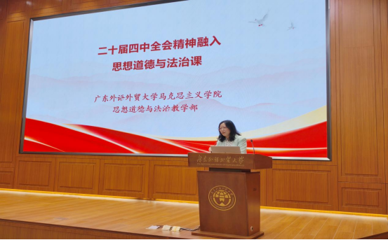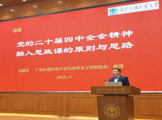 广东外语外贸大学马克思主义学院院长、教授毛国民对党的二十届四中全会精神进行深入解读,并从“为何融入”、“如何融入”、“融入什么”三个方面就党的二十届四中全会精神融入思政课进行全面导课。毛国民强调,一要从创新人才培养的高度来理解和实施党的二十届四中全会精神融入思政课的战略意义,提高将全会精神融入思政课的政治自觉、思想自觉与行动自觉,二是要注意内容的整体性,深入领会全会的重大意义,牢牢把握全会的鲜明特点,系统掌握全会的主要内容,明确践行全会精神的责任要求;三是要备好教材备好学生,联系当前经济建设与社会发展实际融入,立足“十五五”6个原则、7个目标、12项重点任务,融入相应的思政课程;四要切实做好教材、教学课件、教学案例的重构,实现从文件到教学内容、教学要点的转变。他还提出了阶段、专题、互动式的融入思路以及各门思政课融入的主要内容以及要点。