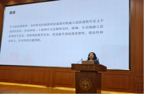 我校马克思主义基本原理教学部主任汪雪就党的二十届四中全会精神融入《马克思主义基本原理》的教学提出两个思路,一是内容重构,实现由“文件原文”向“教学要点”的转变;二是教学方法和模式的创新,实现从“被动接受”到“主动建构”的转化。